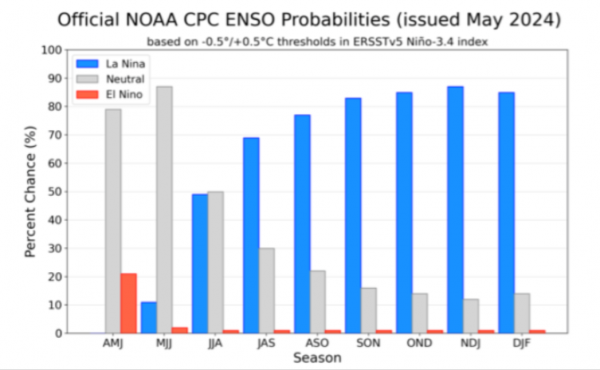 所以,这意味着最快在7月,就可能看到拉尼娜现象的发展,而且根据NOAA的模型预测,今年11月到明年1月,拉尼娜现象的出现概率高达87%,这也意味着它将影响整个冬季。