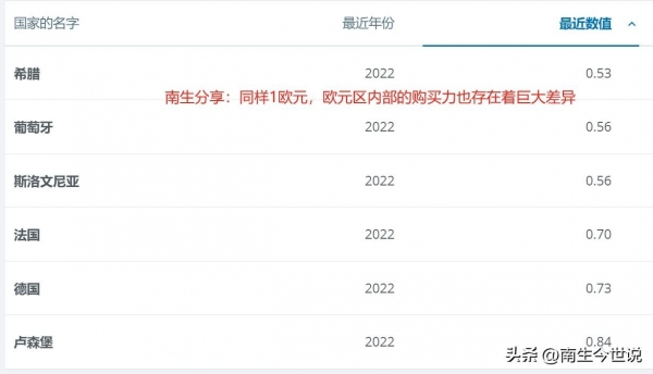 仍以世界银行公开的为例,欧元作为欧元区20个国家的共同货币。在德国境内,2022年的时候0.73欧元的购买力,就相当于美国境内的1美元。