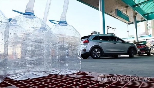 在京畿道高阳市的一家加油站,摆放着用完的车用尿素溶液空桶