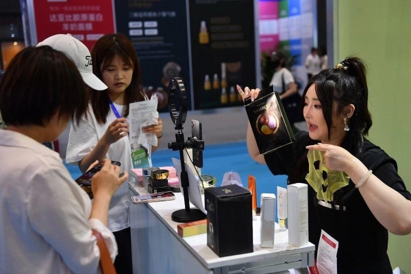 在日韩进口商品博览会上,一名工作人员在直播销售韩国产面膜