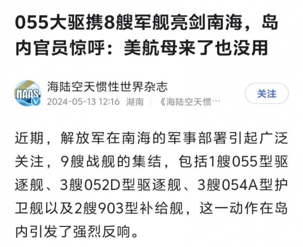 这11艘军舰分别是1艘055大驱、4艘052D驱逐舰、4艘052A护卫舰、2艘903型补给舰,共计11艘战舰组成中国特混战队的强劲阵容,下面就来说说这几艘战舰的真实水平到底如何。
