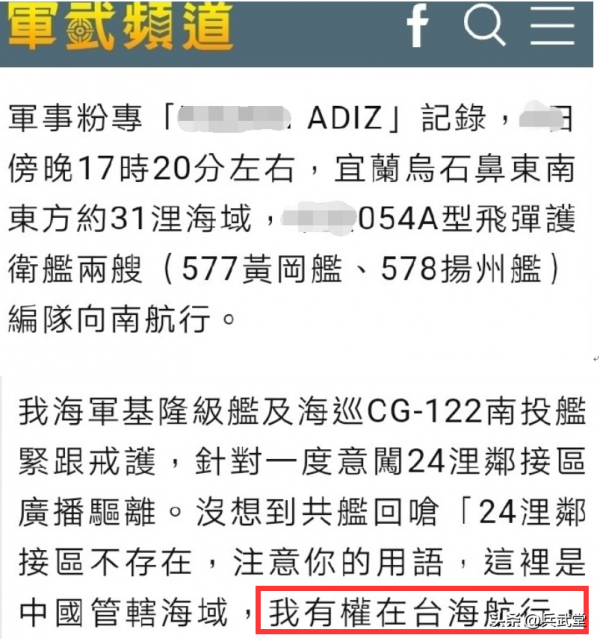 从报道内容中来看,054A回怼对方,向万吨级基隆舰霸气喊话"你所谓24海里临接区不存在,注意你的用语,这里是中国管辖海域,我有权在台海航行。" 其中这一句"这里是中国管辖海域"已经说的很明白了,实际上现在已经不单单是围岛这么简单,而是开始从台岛北部、东部等多个方向没收对方的海域管辖权,这是和以往行动很大的区别。