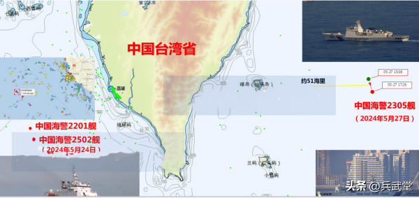 这种实力的差距,也让海警有了很大的发挥空间。外媒报道5月24日,中国海警2502舰和2201舰编队被发现出现在高雄市以西偏北约50海里的海峡南口巡航;5月27日下午,中国海警2305舰被发现在台湾省东南部的绿岛以东约51海里处巡航,随后该舰AIS关闭。