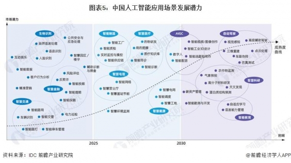 根据IDC和浪潮信息联合发布的《2022-2023年中国人工智能计算力发展评估报告》,人工智能市场有巨大发展潜力。当前,生物识别、智慧金融等领域应用较为成熟。2025-2030年,智能制造、智慧医疗和智慧电信将会是发展潜力较大的领域。长远来看,AIGC和自动驾驶将是最具发展潜力的应用场景。