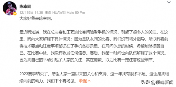 对此,记者采访了对WTT世界乒联相关比赛规定熟悉的专业人士。该人士分析,陈幸同刷手机应属无心之举。