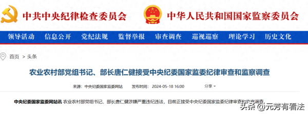 据中纪委监委5月18日最新消息称,农业农村部党组书记、部长唐仁健涉嫌严重违纪违法,目前正接受调查。