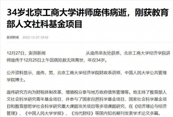 虽然不知道庞伟老师具体得什么病去世的,但大家从庞伟老师博士期间完成了16篇高水平论文,以及在34岁就开始主持含金量非常高的教育部社科研究项目来看,庞伟老师做科研非常拼。