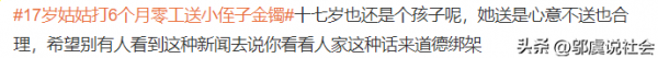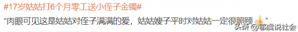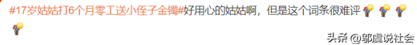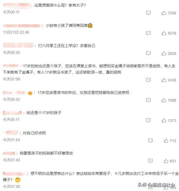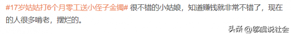 然而,这个事件在社交媒体上引发了热烈的讨论。有人认为,17岁的姑姑本应该在学校读书,现在却为了一个金镯子而辛苦打工,这反映了家庭贫困的现实。也有人认为,这个事件被歌颂有些讽刺,因为并不是每个家庭都有能力或意愿去实践这种形式的家庭之爱。