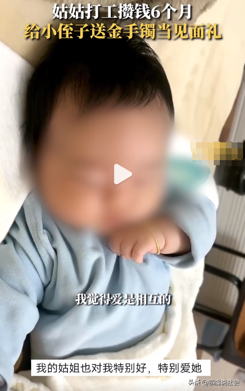 在中国的传统文化中,金镯子常常被视为吉祥和富贵的象征,也是长辈送给晚辈的常见礼物。姑姑用这种方式表达对小侄子的爱和祝福,也体现了她对家庭的责任感和付出。