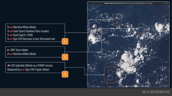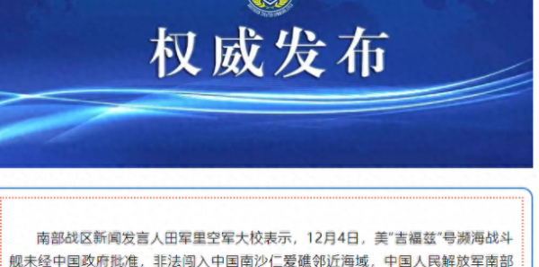 在12月5日上午,就有国外专业航海信息网站披露了在4日清晨,中美两国海军在仁爱礁海域的对抗情况。这个网站公布的拍摄于12月4日清晨8点40分的卫星照片上,当时的美军"吉福兹"号濒海战斗舰正在仙娥礁西南方向航行,而当时有一艘中国的海军054A型护卫舰就在"吉福兹"的一旁紧跟着,对它进行跟监警戒,严控它的行进路线,防止它做出越线的冒险行为。