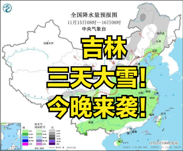 今日是11月15号周三。边境之外,外蒙古地区的浩荡降雪正在迎着西北风向东北地区进发,预计今晚10点到12点之间,吉林地区将会迎来这股雪潮,并将持续三四天,预告多地将迎来暴雪甚至大暴雪,请大家做好相应准备。