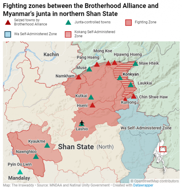 反政府的缅甸"伊洛瓦底"网站报道称,自10月27日以来,由缅甸民族民主联盟军、阿拉干军和德昂民族解放军发动的"1027行动"已经占领了掸邦北部中国边境附近的至少130个军事阵地。中国和缅甸重要城市曼德勒之间的贸易路线被封锁,给军政府带来了越来越大的后勤压力。