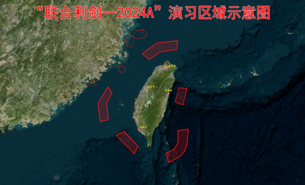 5月23日-24日,解放军东部战区组织了"联合利剑-2024A"军事演习,出动了海军、空军、陆军以及火箭军的单位,对台海周边5大区,还有金马澎等离岛,开展了实战化演习训练。