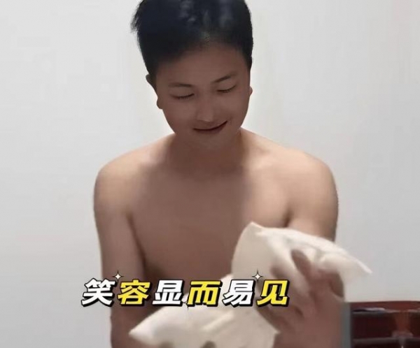 第二个镜头中孩子已经出生了,到了练习变成实践的时候了,原本满脸笑容练习抱娃的男子,依然光着膀子在家抱娃。