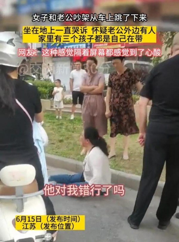 6月15,江苏,一段女子和丈夫吵架从车上跳了下来坐在路边哭泣的视频引发关注。有网友说,隔着屏幕都能感受到她的辛酸。