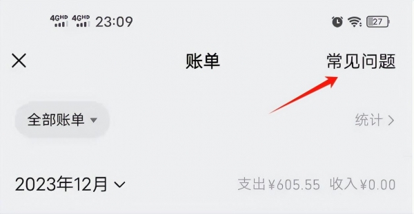 2.在账单页面中,可能很多人也经常看,可以显示我们所有的账单记录,每天的消费明显都是一目了然的。但很少人知道右上角的"常见问题"的用法,我们此时点击进入。
