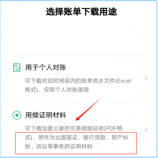 4.点击下载以后,我们就进入到了"选择账单下载用途"的页面了,在这里面,我们只要选择"用做证明材料"就可以了,从下面一行小字也可以看出来,是可以用作签证、银行贷款、财产纠纷和诉讼等事务的证明材料的。