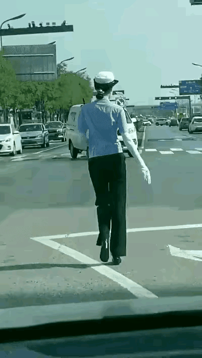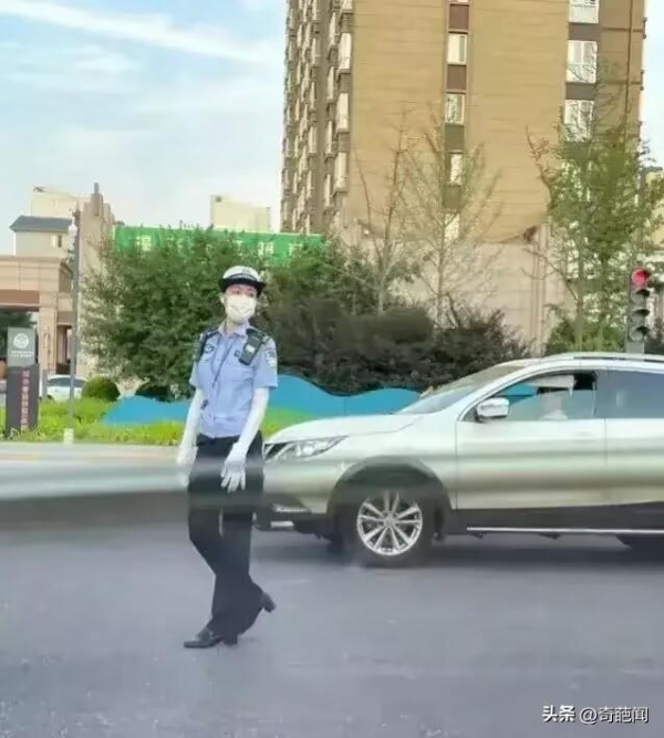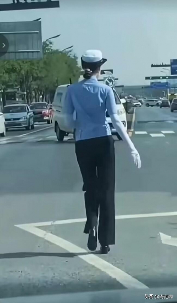 视频画面中这位女交警身穿蓝色制服,穿着略带跟的黑色鞋子、戴着白色袖套防晒,乍一看只是一位普普通通的一线工作者,然而奇葩的是,不仅没有人关心她被汗水浸透的工作服,反而还被人吐槽她走路姿势像走秀。
