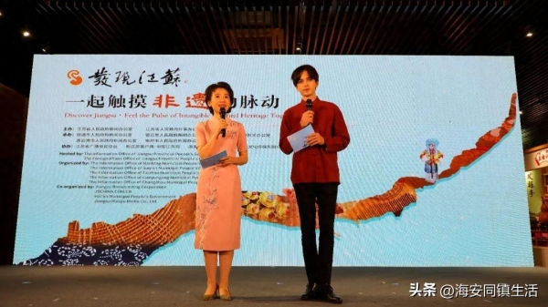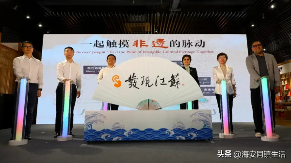 最后,省市领导和外籍友人代表按动启动按钮,"发现江苏"非遗文化扇徐徐展开,标志着"发现江苏·一起触摸非遗的脉动"活动正式启动。