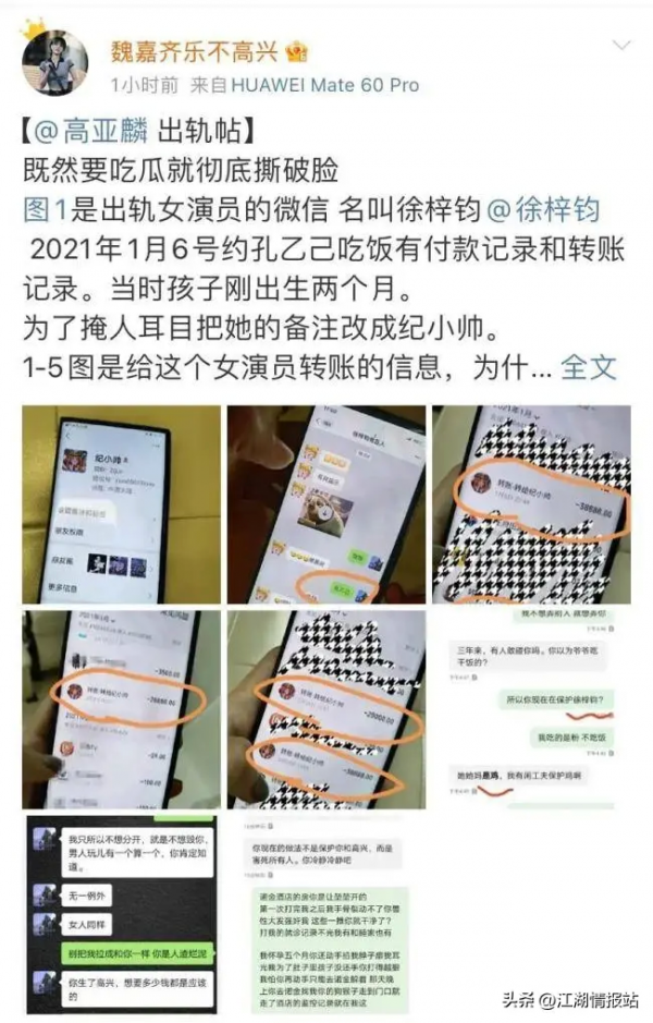 她曝光了高亚麟与另一位女演员的聊天截图,并展示了高亚麟多次给对方的大额转账记录。