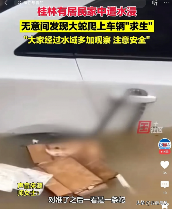 桂林的雨下得太大了,很多蛇都无处可藏了,他们爬在电线杆上的也有,趴在路边栏杆上也有,也有爬到树上的,也有爬到汽车上的。所以大家在行路的时候一定要小心点,千万别被毒蛇咬上。