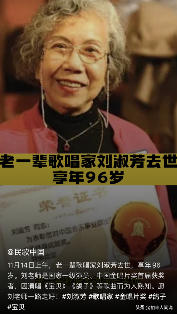 11月15号,有网友在视频账号上透露悲痛消息,96岁知名歌唱家刘淑芳不幸去世,不过关于其身后事,以及去世的一些细节并没有曝光。