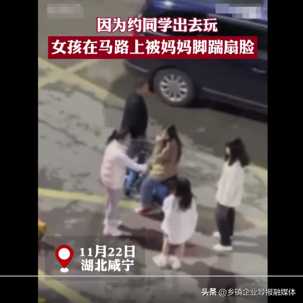 11月22日,湖北咸宁。一位母亲疑似因女儿半夜不回家和同学在外玩耍,怒气上升,当街教育孩子。