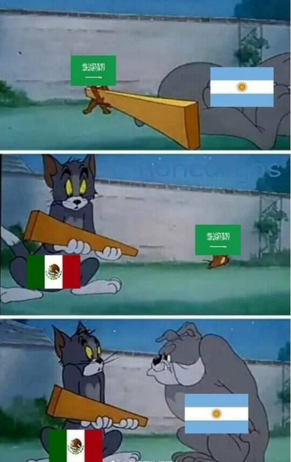 还有网民用沙特之前的梗图来调侃,谁能想到,沙特"帮"墨西哥叫醒的是一只庞然大物呢?