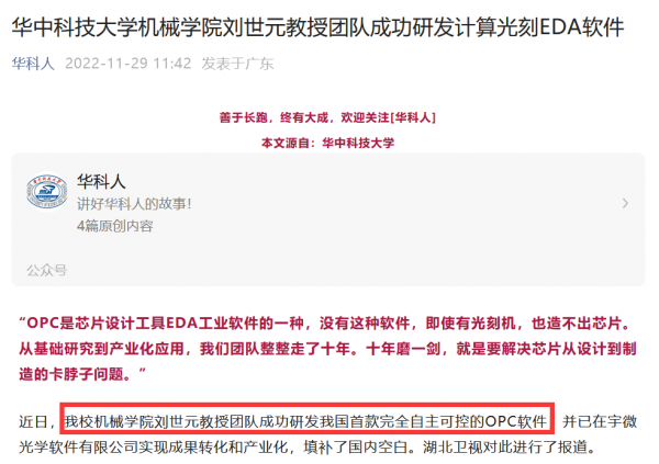 耐人寻味的是,在东方晶源称该公司计算光刻产品(OPC)完全自研的同时,华中科技大学机械学院刘世元教授团队近日也宣布研发出我国首款完全自主可控的OPC软件,并称从基础研究到产业化应用整整走了十年,填补了国内空白。