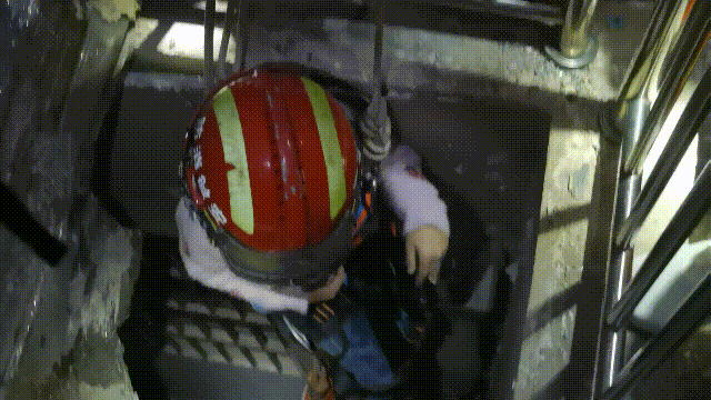 随后,一名消防员在下方进行托举,另外两名消防员从上方缓慢拉起。