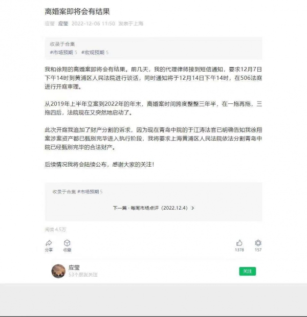 徐翔妻子应莹:离婚案将有结果,要求分割已甄别完毕的合法财产