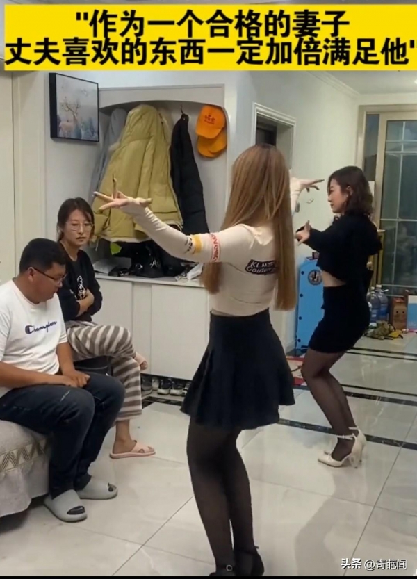 只见老婆找来两个身材苗条的女子专门在自己老公面前热舞,丈夫见状顿时傻眼了全程低头不敢看,结果被一旁的妻子揪着其头皮一把拉起,妻子洋洋得意地表示:"作为一个合格的妻子,丈夫喜欢的东西一定要加倍满足他",网友对此议论纷纷。