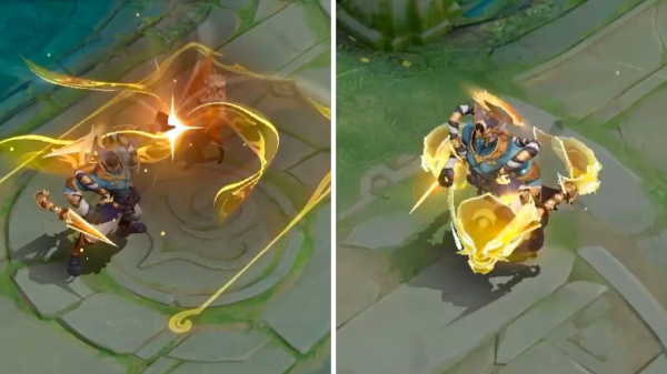 再就是二技能特效和大招特效,如下图所示,二技能命中敌人之后,会在原地留下一个降魔杵,三技能的特效看起来就好像是一个竞技场,四周被金色的锁链围绕,四个角各自放着一把降魔杵,墨子站在最中间,在释放这个技能的时候,还会有锁链碰撞的音效。