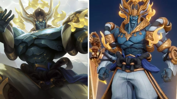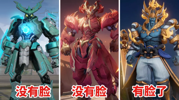 首先来看一下墨子的这款新皮肤,如下图所示,左边的是皮肤海报,墨子的造型像极了神话故事神话人物,身体以青色的巨石铸就,面部威严、神情严肃,宛如一位惩恶扬善的魔神,头上的头冠也非常帅气。皮肤的展示建模在颜色上面和海报有一定的差距,展示建模的颜色要更深一些,不过模型的精细度还是没有问题的,面部塑造的非常有特点,身上的服饰细节也基本上都做到了还原。