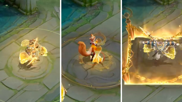 再来看一下这款皮肤的特效,如下图所示,强化普攻的特效是很多金色的符号出现在强化普攻的范围里面,让强化普攻看起来像是一张神符,然后释放技能之后,墨子获得盾的时候,身上会出现三张面具,造型非常有压迫感。