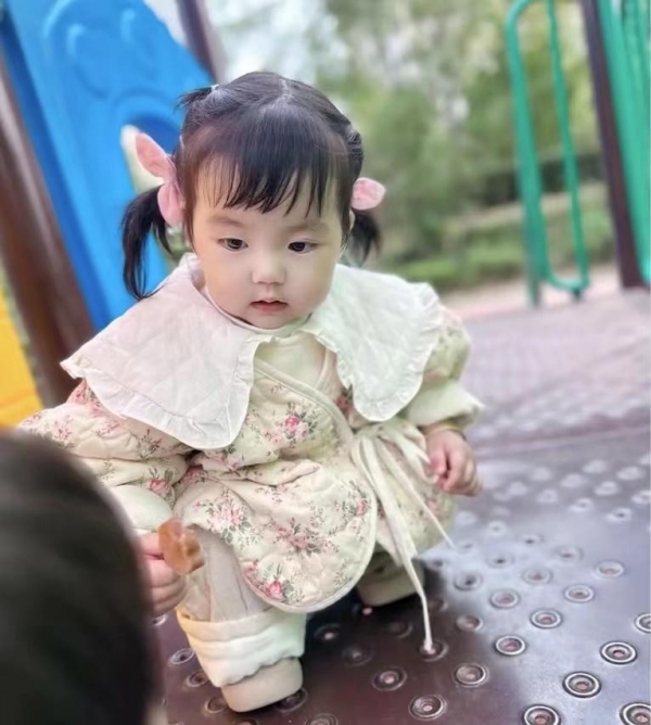 孩子估计是经常在外面跑跳,所以额头上汗津津的,刘海成了一缕缕的,爸爸笑称女儿变成高原红的肤色了。