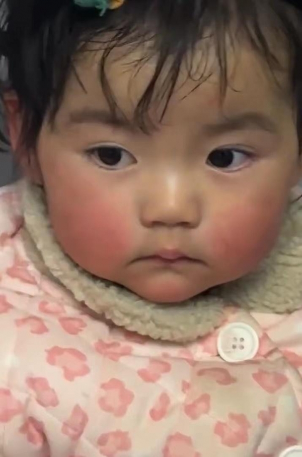 画面中,女儿穿着白色碎花的小棉袄,扎着两条可爱的小辫子,头上别着黄色的花朵发夹,关键是孩子的小脸蛋,红扑扑的,脸上脏兮兮的,看起来变黑了许多。