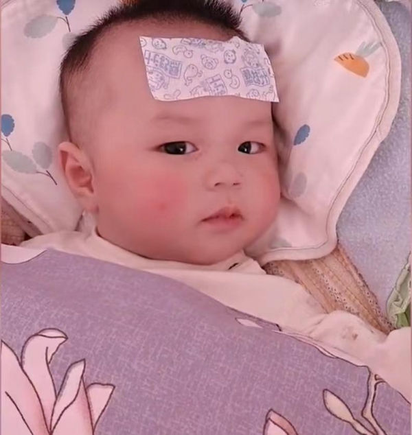 画面中,一个可爱的宝宝躺在床上,看着脸色绯红,眼眶中含着泪水,头上贴着退烧贴,孩子发烧了,烧得满脸通红,看起来他也很难受,精神不像平时那样好,不想动。