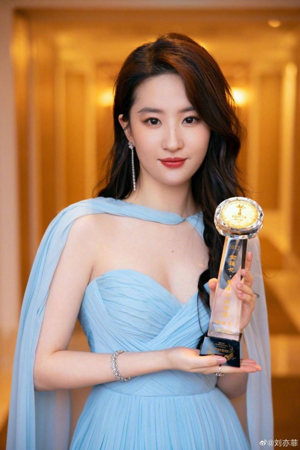 她还晒出举着奖杯的合照和现场领奖照,只见刘亦菲穿一袭淡蓝色抹胸纱裙,披着同色系披肩,长发披肩妆容精致,优雅迷人。