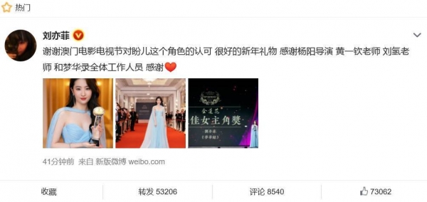 刘亦菲在微博发文感谢:"谢谢澳门电影电视节对盼儿这个角色的认可,很好的新年礼物,感谢杨阳导演、黄一钦老师、刘氢老师,和梦华录全体工作人员,感谢!"