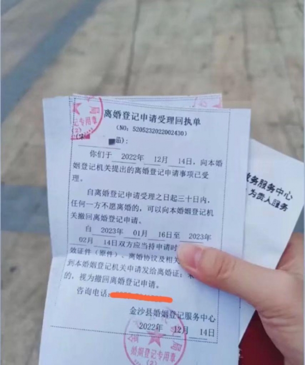 坐标贵州毕节,有网友分享了自己的情感经历,女子手里拿着一份"离婚登记申请受理回执单",清晰地写着她和老公因为感情问题,正处于离婚冷静期,按照正常程序,如果不出意外的话,下个月他们就可以拿到离婚证了。