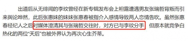 "三角恋"风波最终是李玟澄清说张瑞哲没有劈腿,两个人分手也只是因为性格不合以此平息了舆论。