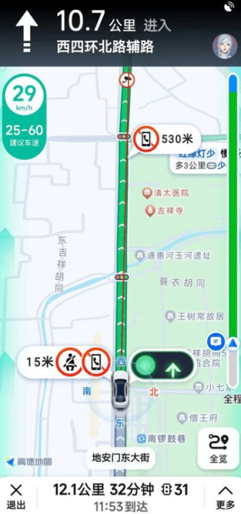 其实小雷也算是一个新手司机了,在路上频繁遇到红灯,很容易影响驾驶体验。如今高德地图基于北斗卫星导航系统高效的定位能力以及人工算法,推出"绿灯导航"功能,可以保证车辆安全的情况下,算出车辆通过前方路口时绿灯的时速范围,从而实现一路畅通,这对新手司机甚至是老司机来说,无疑是比较友好的,毕竟"一路绿灯"的驾驶体验要是放在之前,还是很难实现的。