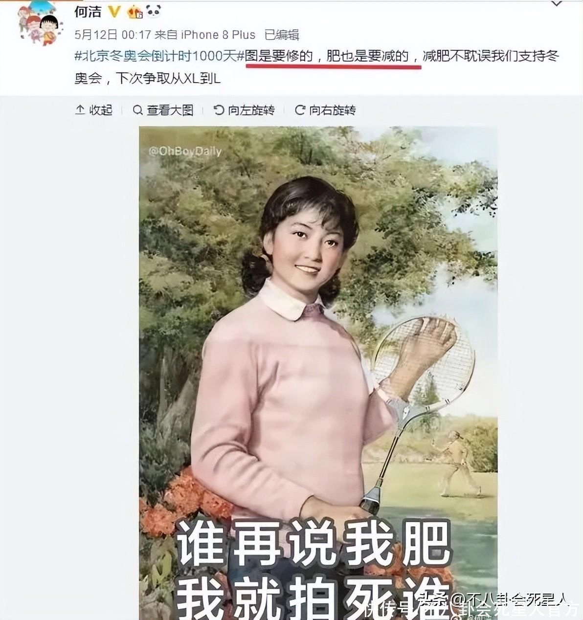 但是,现场图流出后,真是令人大跌眼镜,这反差也太大了吧。没有p图的何洁,手臂粗壮,"水蛇腰"立刻变成"水桶腰"。