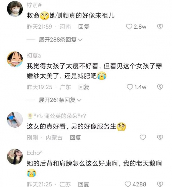 还有网友评论说,我本来觉得女孩子太瘦不好看,但看见这个女孩子穿婚纱太美了,我还是开始减肥吧!