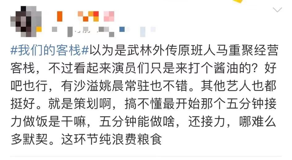 整个游戏环节看下来,五个人做了三盘鸡蛋,会做饭的人真的寥寥无几。有网友开始吐槽,本以为是《武林外传》原班人马重聚经营客栈,谁料只是个噱头。节目组设置五分钟接力做菜的环节,纯属浪费粮食。