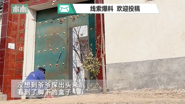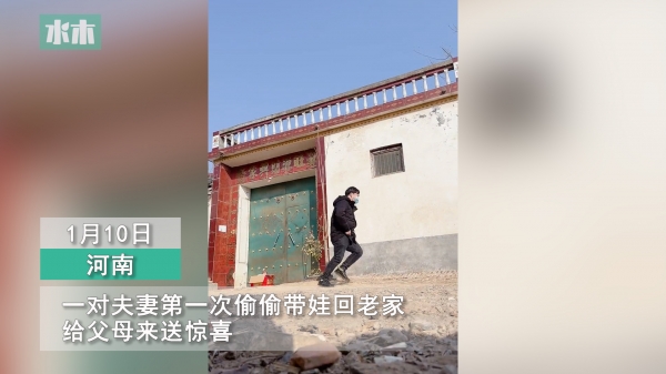 1月10日,河南,一对夫妻第一次偷偷带娃回老家,给父母来送惊喜,男子把孩子放到纸箱后,敲了敲爷爷家的门,便迅速躲了起来。