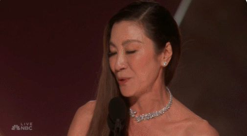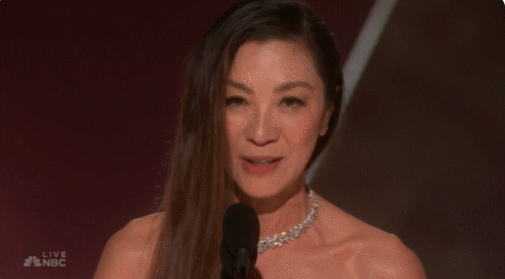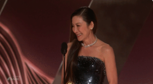 在催场音乐中,杨紫琼不急不慢地继续发表获奖感言,她感谢了《瞬息全宇宙》的导演和编剧,谢谢"他们有勇气写一个非常普通的移民、亚裔、女性、母亲、女儿的故事",还提到了这个角色对女性和移民的意义。