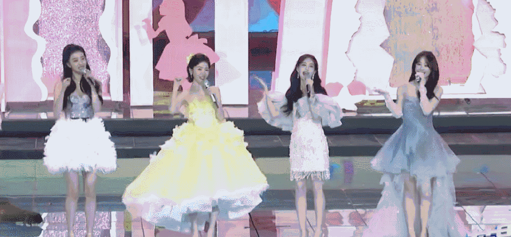 这次四位和一群儿童在表演,这群孩子的头上都有很可爱的玩偶,确实是特别的可爱。四位一起表演这时候效果太满,感觉像迎来了新年的喜庆感,舞台布景也是特别的漂亮,后面有很可爱的兔子装饰,像是在拍一部卡通剧。