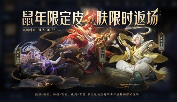 今年春节官方特意安排了,三款限定皮肤直售返场,分别为:韩信-飞衡、庄周-玄嵩、甄姬-幽恒,同属鼠年限定。